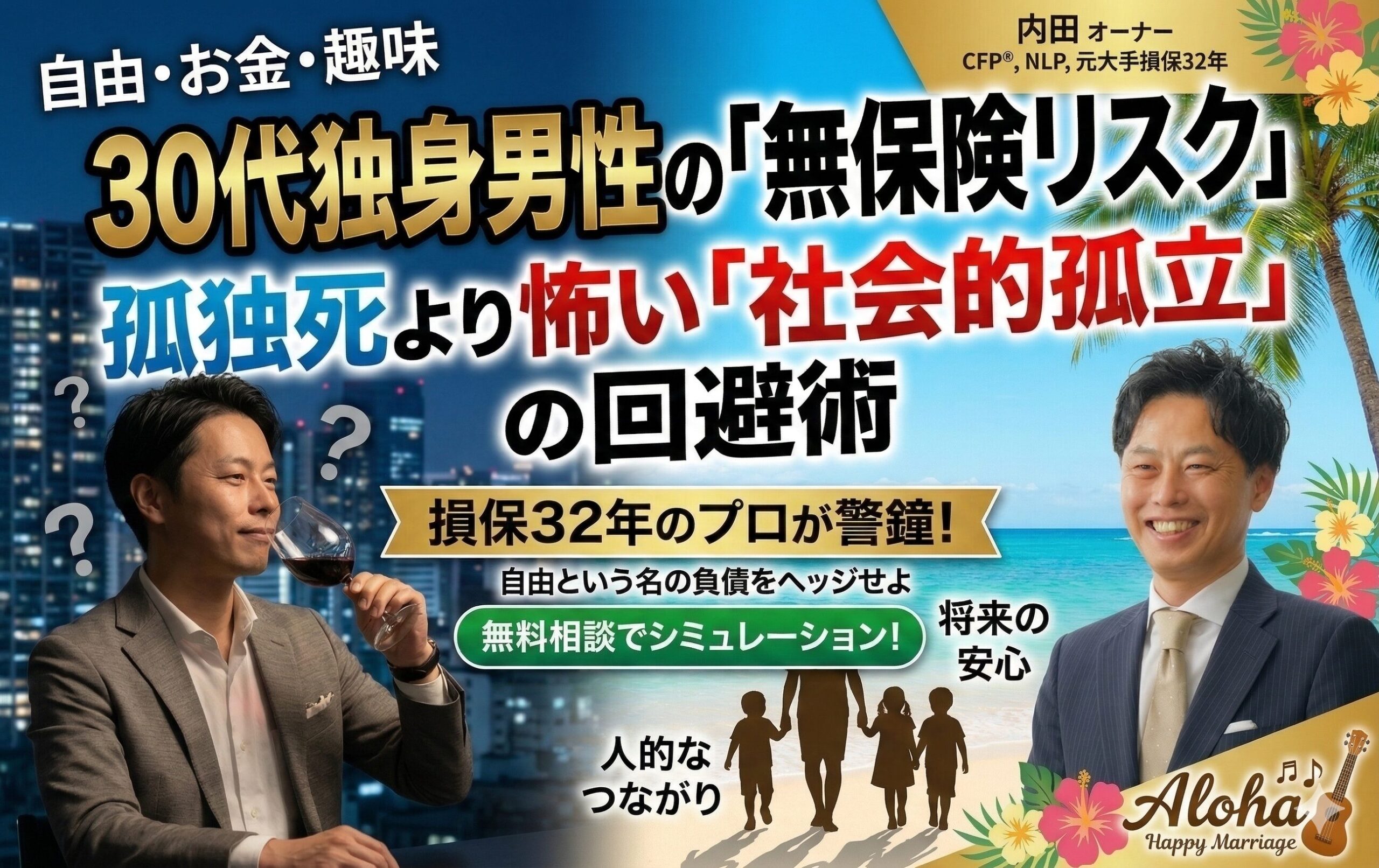 40代後半で孤独を痛感してから動くのは、火災が起きてから保険に入るようなものです。 30代前半の今であれば、私が提供するNLP(心理学)を用いた対人スキルと、FPとしての資産形成戦略を掛け合わせ、「孤独を回避し、かつ資産を最大化させる戦略的な結婚」が確実に狙えます。